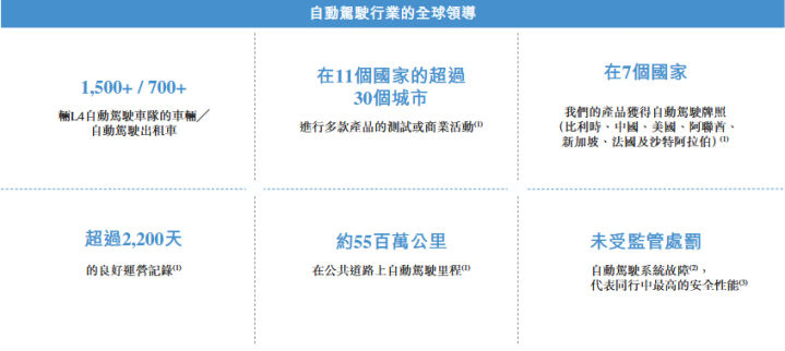 截至2025年10月17日,小马智行已运营一支由超过680辆自有自动驾驶出租车组成的车队,累计自动驾驶里程逾4790万公里,其中无人驾驶里程逾1120万公里。公司也是中国首家于2024年12月获准在跨省高速公路上进行L4无人驾驶的自动驾驶卡车编队测试的公司,截至最后可行日期运营一支由超过170辆自有及租赁自动驾驶卡车组成的车队。