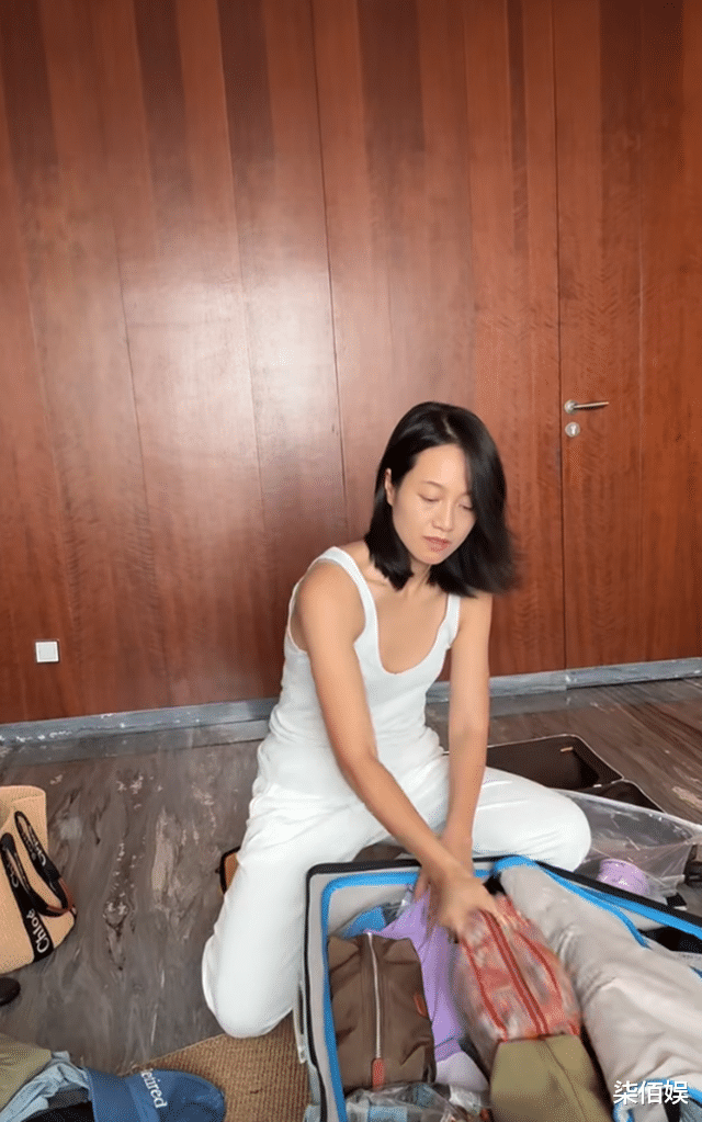 朱丹从收拾行李开始记录,视频中身着白色吊带背心出镜的朱丹,身为两个孩子妈妈的她还是那么瘦,都不显胸。